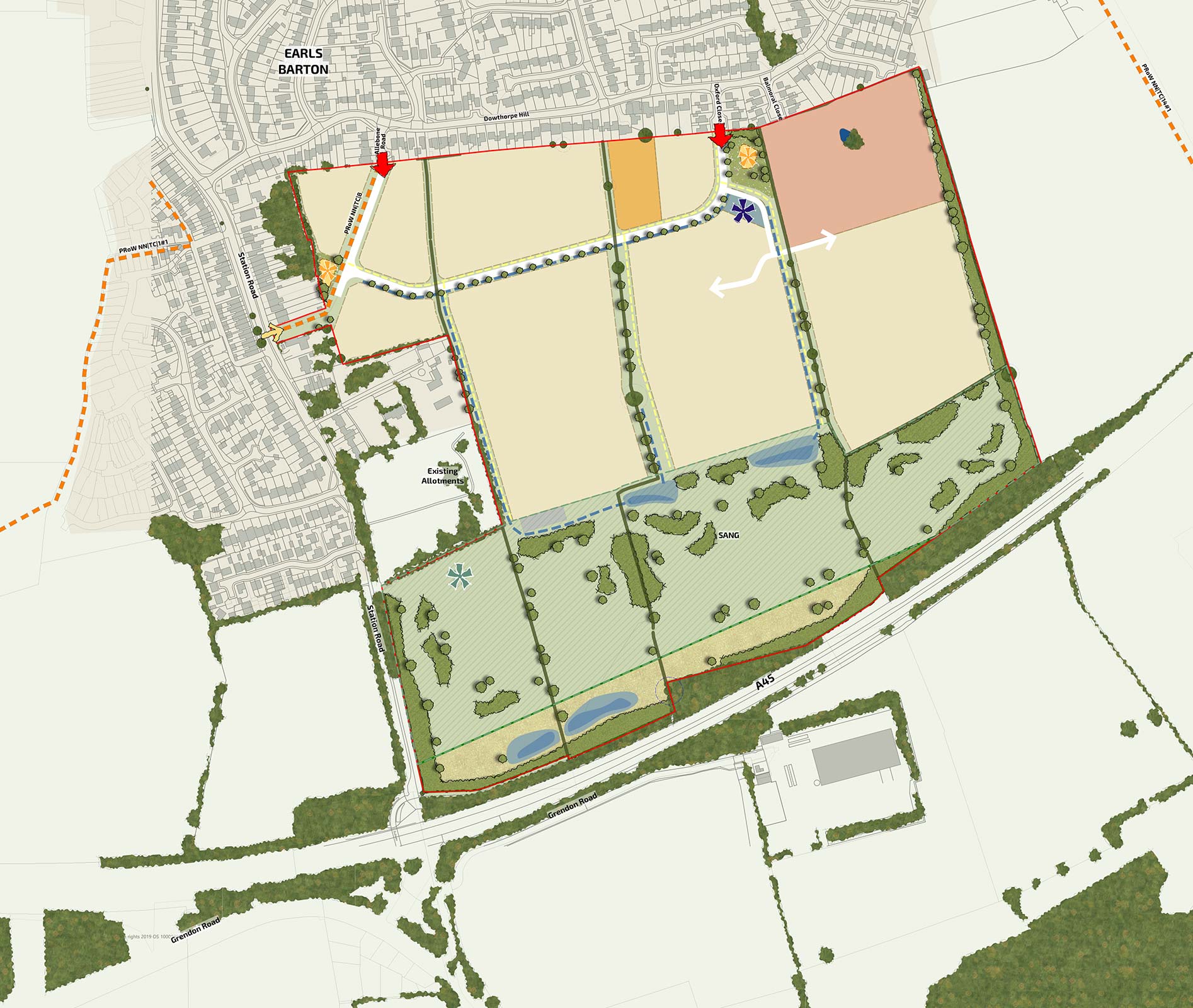 Multiple points of access are being considered to ensure safe and convenient movement throughout the development. Pedestrian and cycle connections are proposed from Station Road and Dowthorpe Hill, creating links with the wider Earls Barton network. Vehicle access will be carefully designed to prioritise safety and minimise impact on the surrounding area.